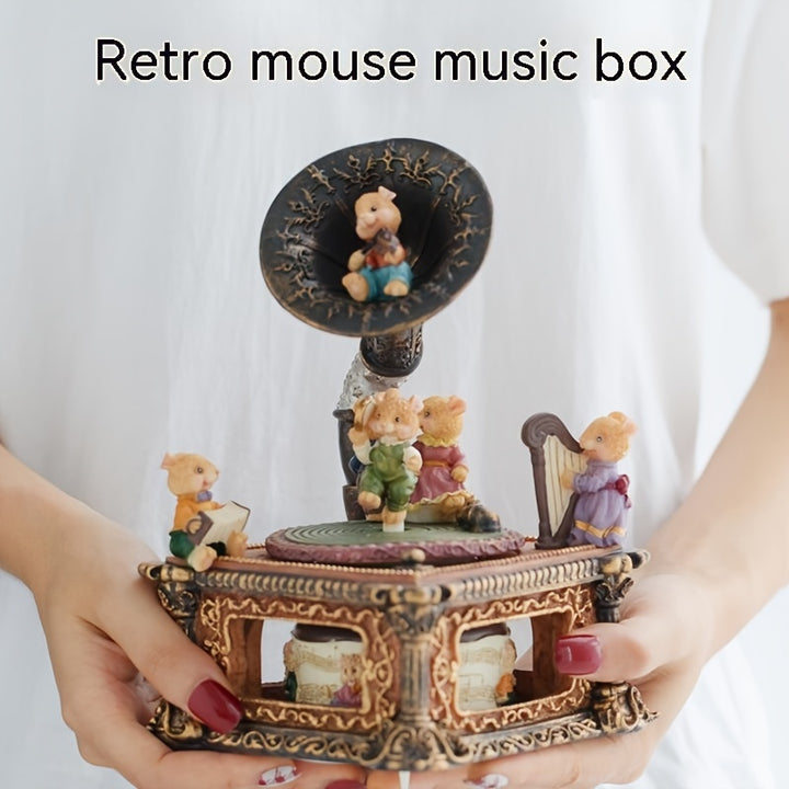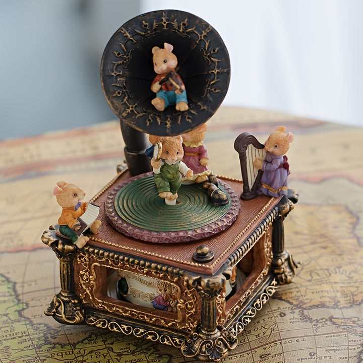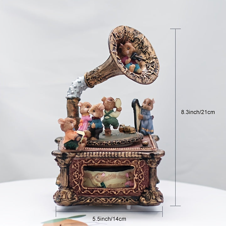 تصميم عتيق: يتميز صندوق الموسيقى الفونوغراف هذا بتصميم كلاسيكي وحنين، يذكرنا بمشغل تسجيل القرص الدوار من الماضي. يضيف لمسة من السحر العتيق إلى أي مساحة.