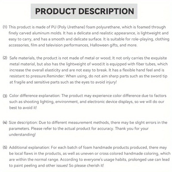 ارفع مجموعة Cosplay الخاصة بك مع نموذج سلاح Sword Sky Game الذي تم تصميمه بدقة بدقة ، مما يضمن ساعات لا حصر لها من المرح الغامرة والآمنة.