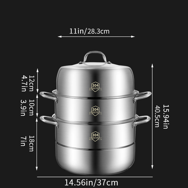 3-Tier Steamer Set: This stainless steel steamer set includes three tiers, allowing you to steam multiple dishes simultaneously. It is perfect for Chinese kitchen cooking, as it enables you to cook rice, vegetables, dumplings, fish, and other delicacies all at once.