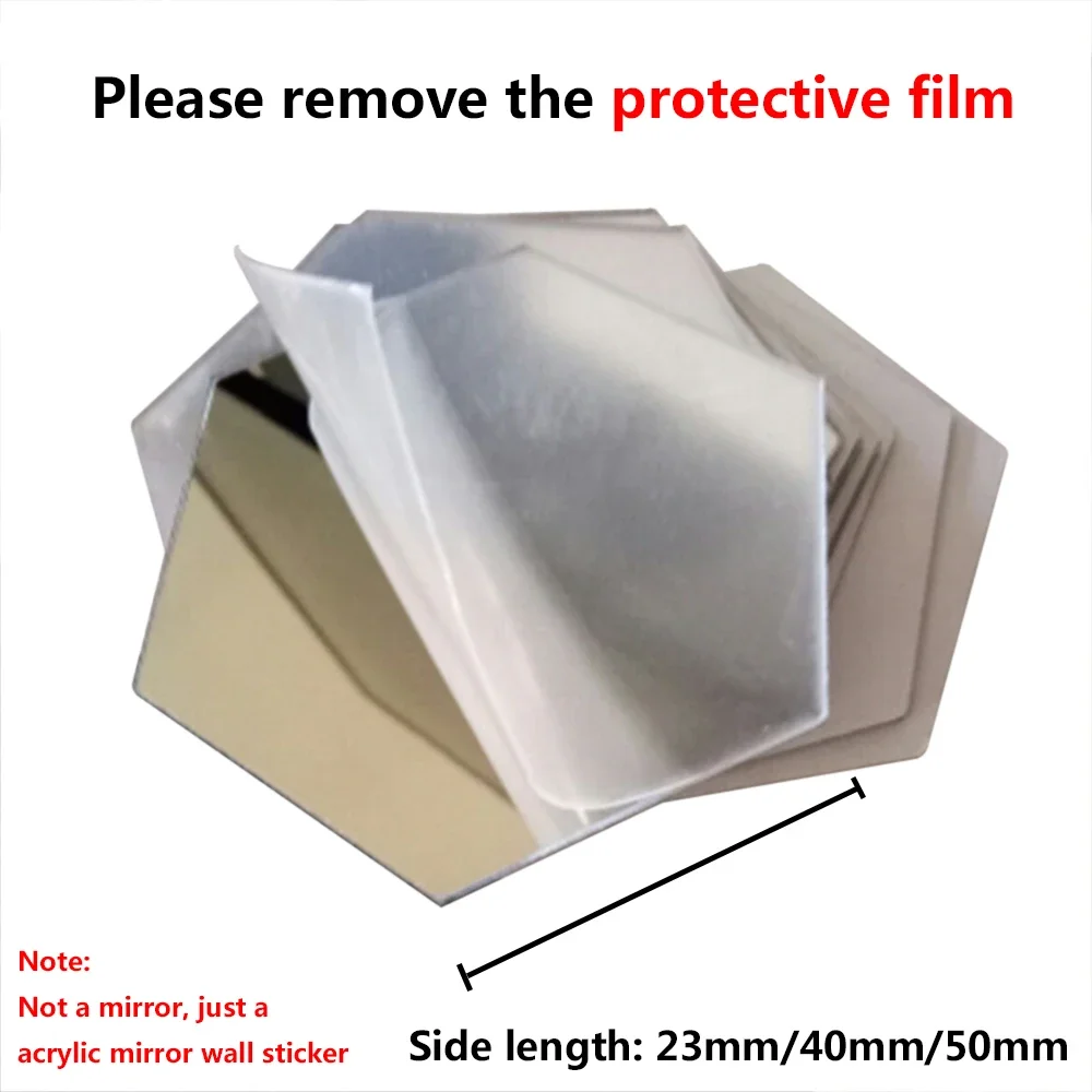 Package Includes: 6/12Pcs* 3D Hexagon Mirror Sticker(Not a mirror, just a mirror wall sticker) Note: 1. There is protective film on mirror wall sticker, please tear off.