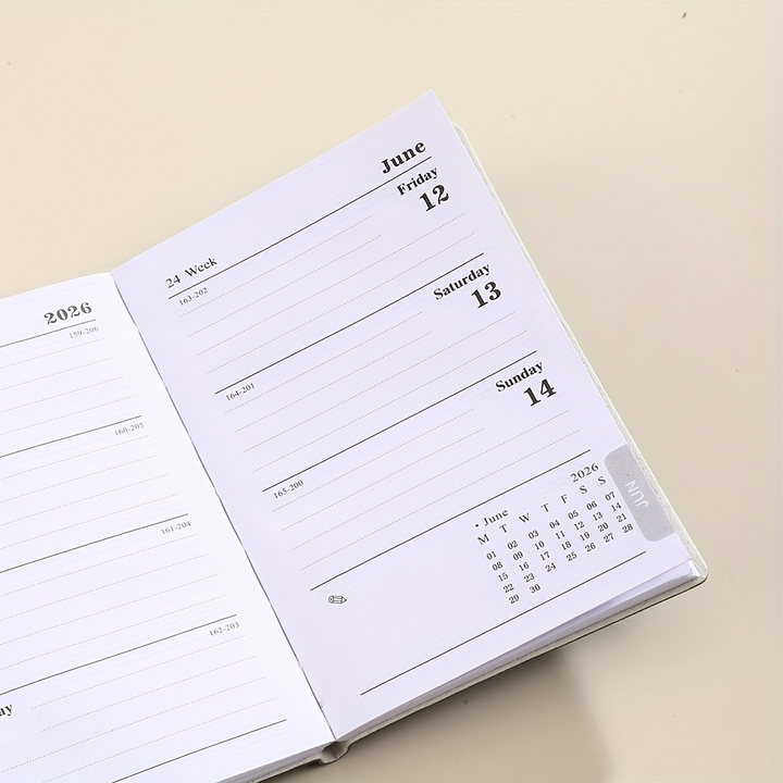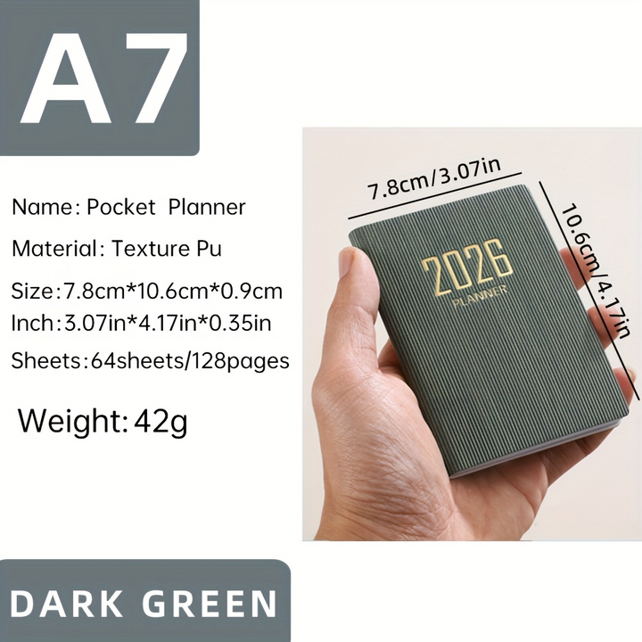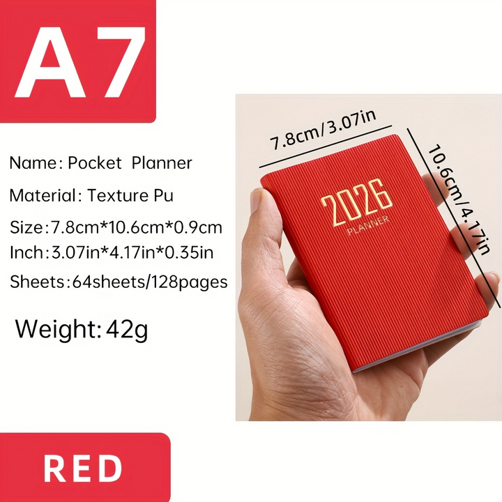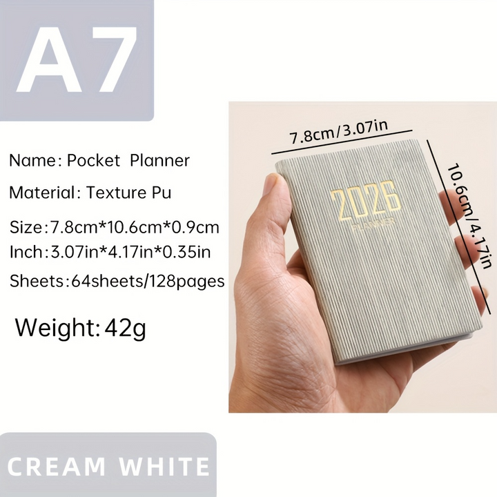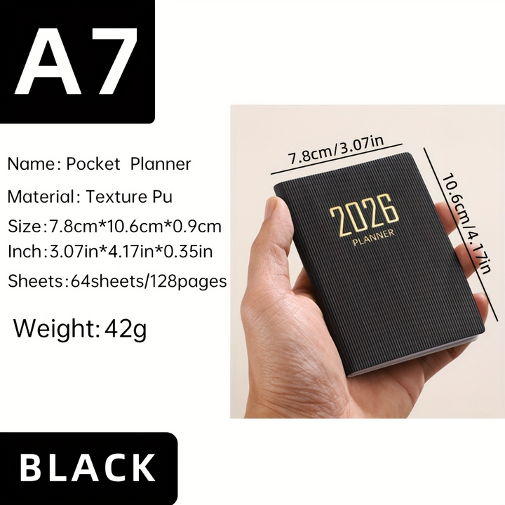 Mini Portable Pocket Size: Designed for ultimate portability, this A7 planner is compact enough to fit easily into pockets, purses, or small bags, making it convenient for on-the-go planning. Its dimensions are 10.59 cm x 7.8 cm.