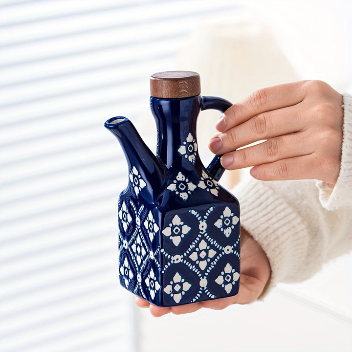 Artistic Floral Design: This ceramic oil dispenser boasts an elegant blue and white porcelain design with intricate floral patterns, adding a touch of sophistication to any kitchen decor.
