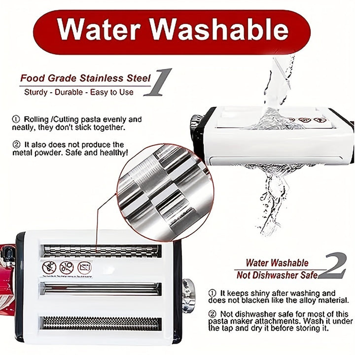 Easy to Clean: The pasta maker attachment is easy to clean. Simply remove any remaining pasta dough and wipe it down with a damp cloth. The stainless steel construction makes it resistant to staining and ensures effortless cleaning.