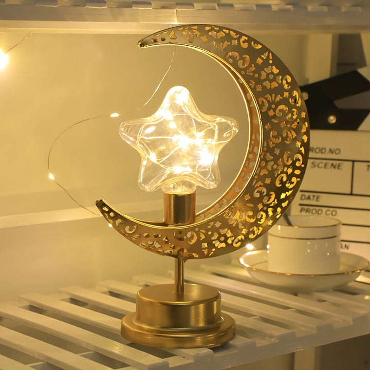 Capture the beauty of the night sky with our Star and Moon Desk Lamp, perfect for adding a magical touch to your home during Ramadan and Eid celebrations. This fairy lamp is a must-have for creating a warm and inviting atmosphere in any room. Enjoy the soft glow of this battery-powered night light, designed to enhance your home decor with its artistic design and wireless convenience.
