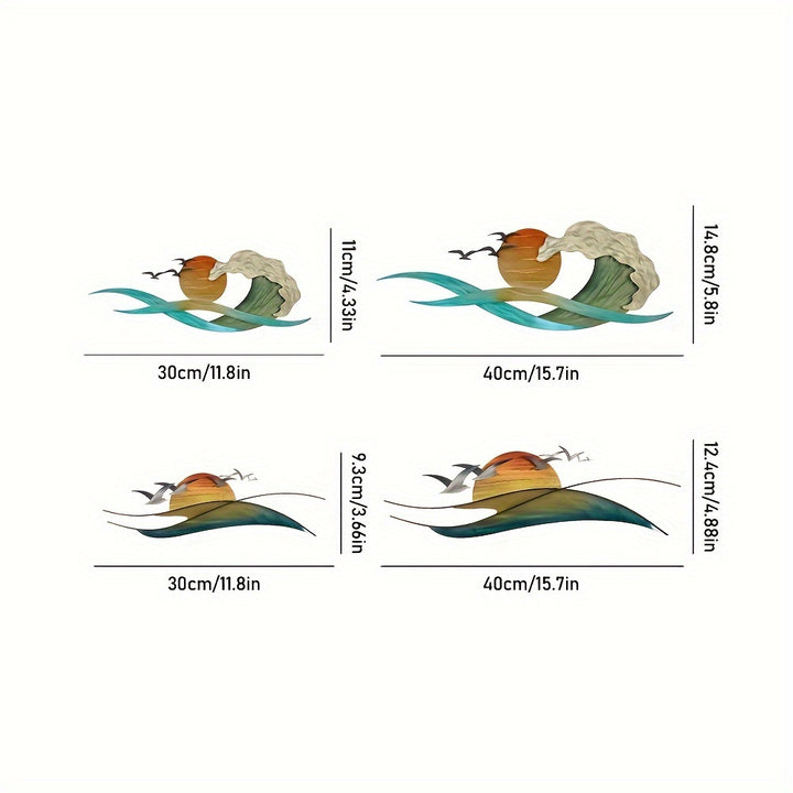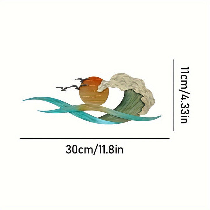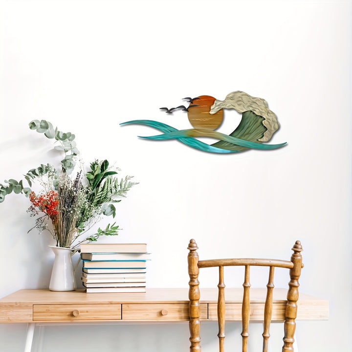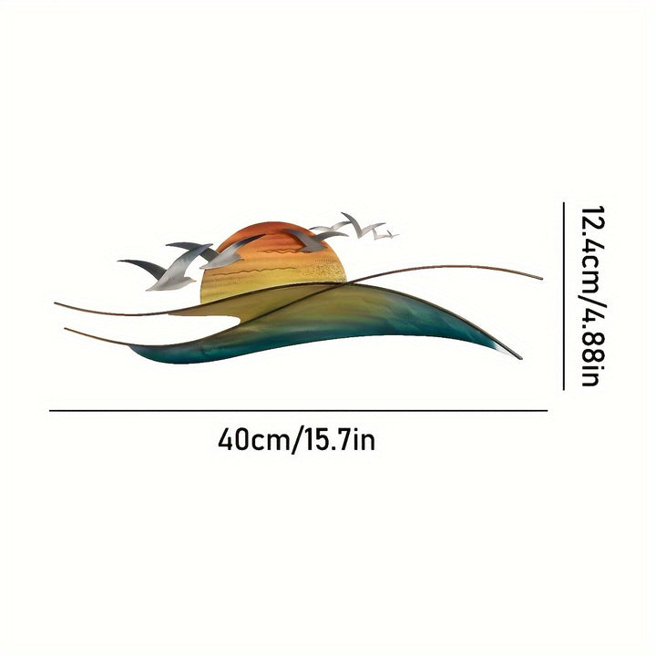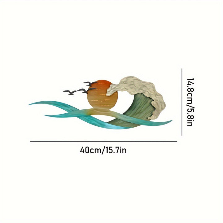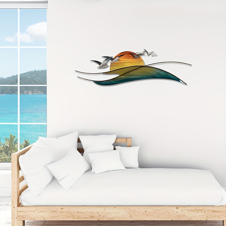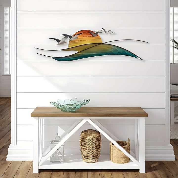 • Beautiful metal wall art featuring waves, a blazing sun, and a seagull