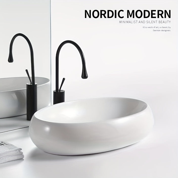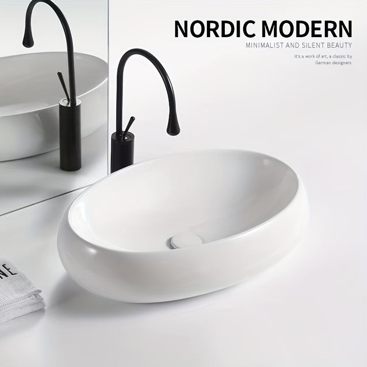 - The Minimalist Oval Countertop Ceramic Basin boasts a Nordic modern style, making it a prime choice for contemporary bathrooms. Its sleek, elegant design seamlessly integrates with any vanity setup, enhancing the overall aesthetic.