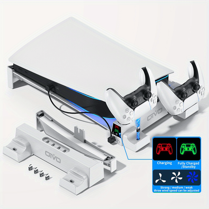 Discharge Cooling Base: The bracket also acts as a cooling base for your PS5 console. It is equipped with a powerful cooling fan that helps dissipate the heat generated by the console during gameplay, ensuring optimal performance and prolonged lifespan.
