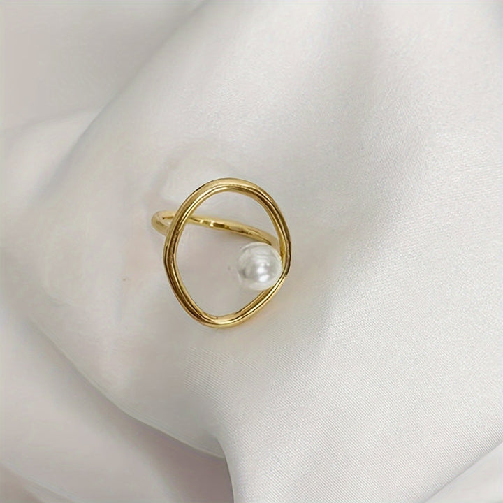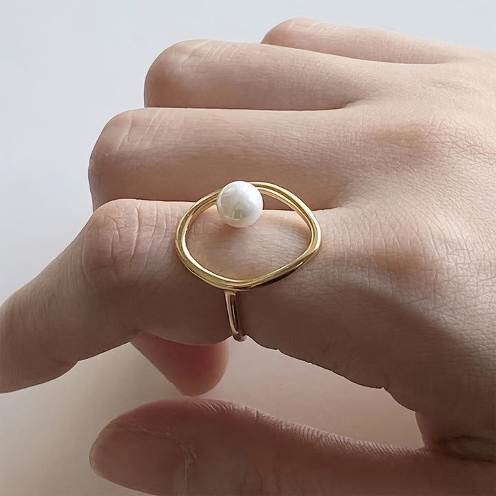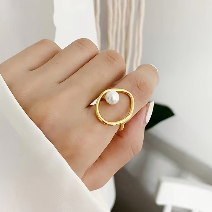 This stylish ring is plated with 14k gold and features an irregular design with inlaid faux pearls, making it a unique and fashionable accessory. The boho style of the ring makes it suitable for daily wear or special occasions. Make a statement with this eye-catching piece that will elevate any outfit.