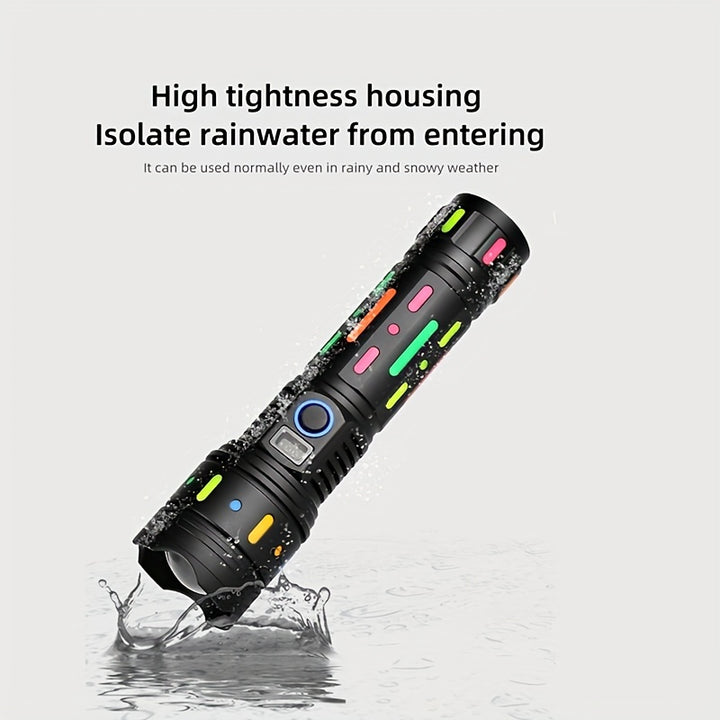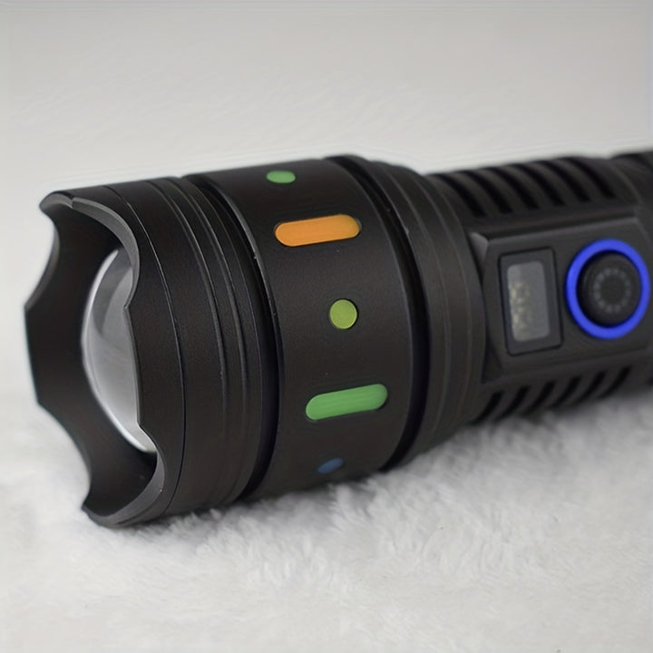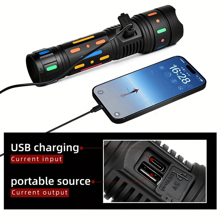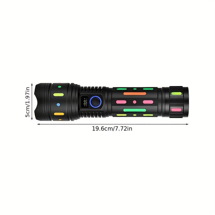 Super Bright Tactical Flashlight with Fluorescent Absorbing Film: This flashlight features a fluorescent absorbing film that enhances visibility in low light conditions, making it perfect for outdoor adventures, emergencies, and everyday use.
