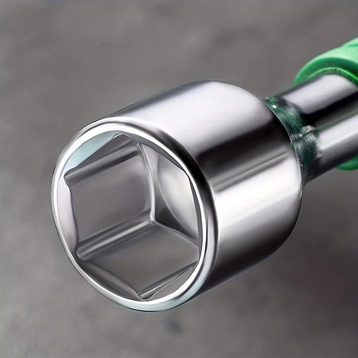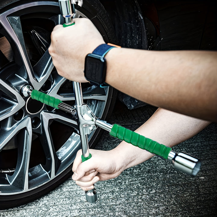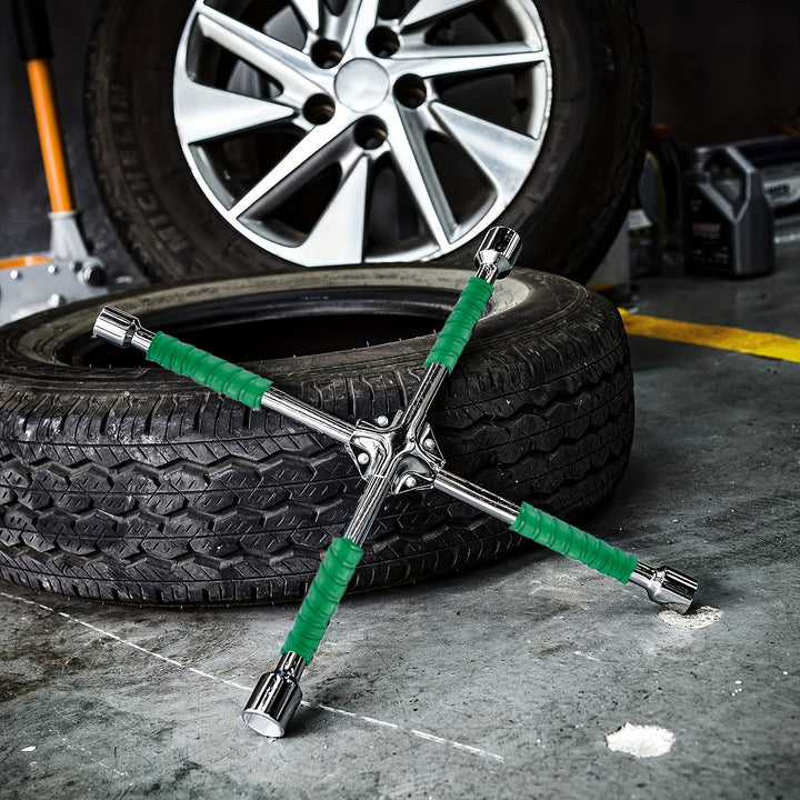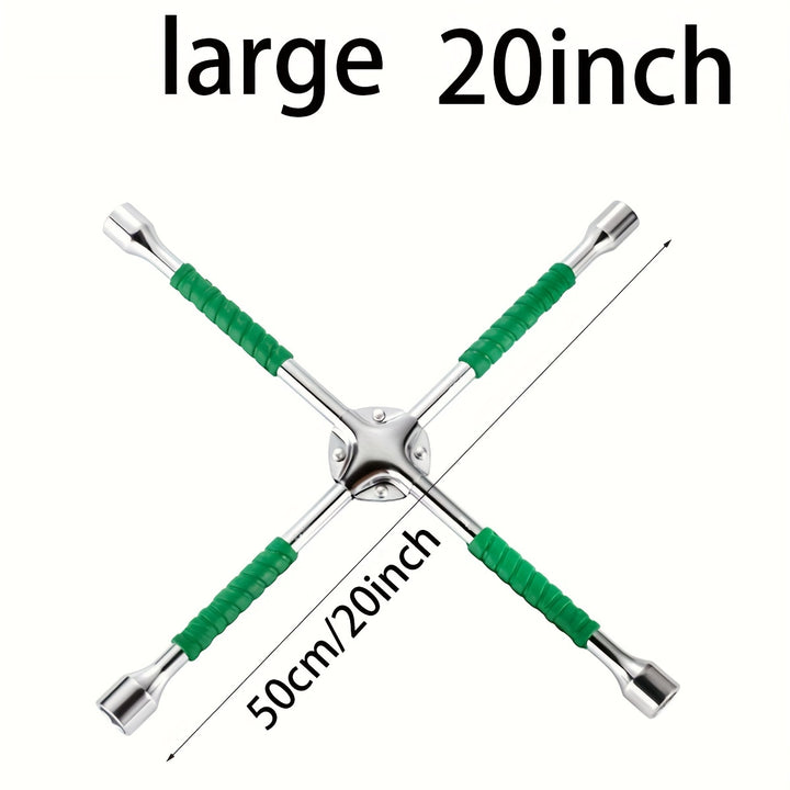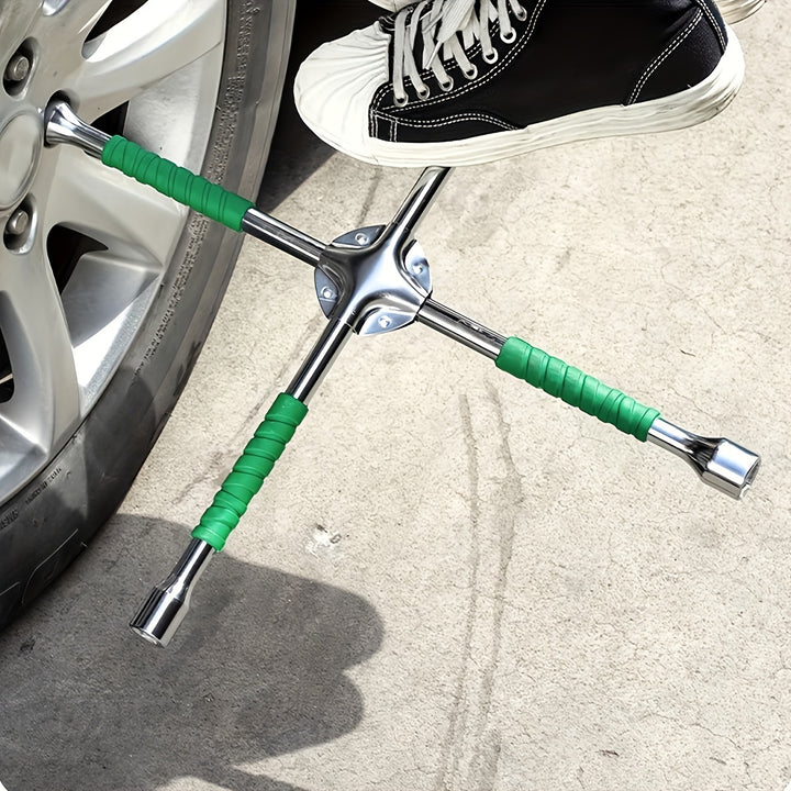 This extended universal tire wrench is a versatile tool designed for disassembling and repairing tires on cars. Made from high-quality 304 stainless steel, it is durable and long-lasting. The cross design allows for efficient removal and replacement of tires, while the socket wrench outer hexagon provides a secure grip. Perfect for any car owner or mechanic looking for a reliable tire tool set.